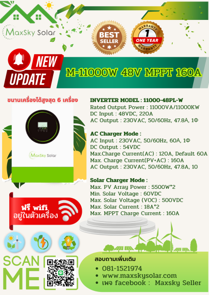 INVERTER รุ่น M 11KW 48V MPPT 160A HYBRID OFF GRID SWITCHING ✅️ขนานเครื่องได้ทั้งหมด 6 เครื่อง ✅️หน้าจอแบบเดิมไม่เป็นจอสี