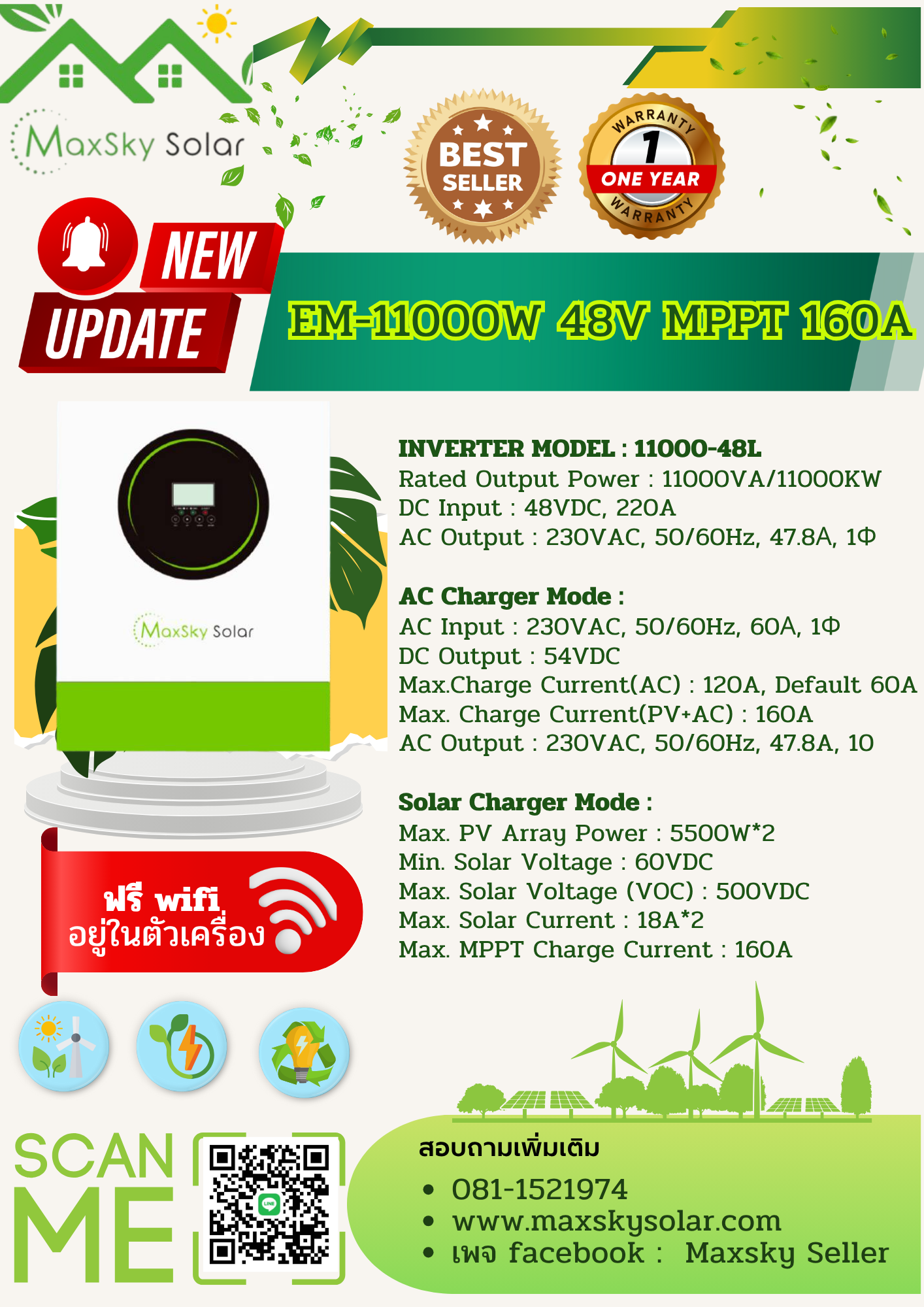 INVERTER รุ่น EM 11KW 48V MPPT 160A HYBRID OFF​ GRID SWITCHING ❌️แบบขนานไม่ได้ ✅️หน้าจอแบบเดิม ไม่เป็นจอสี